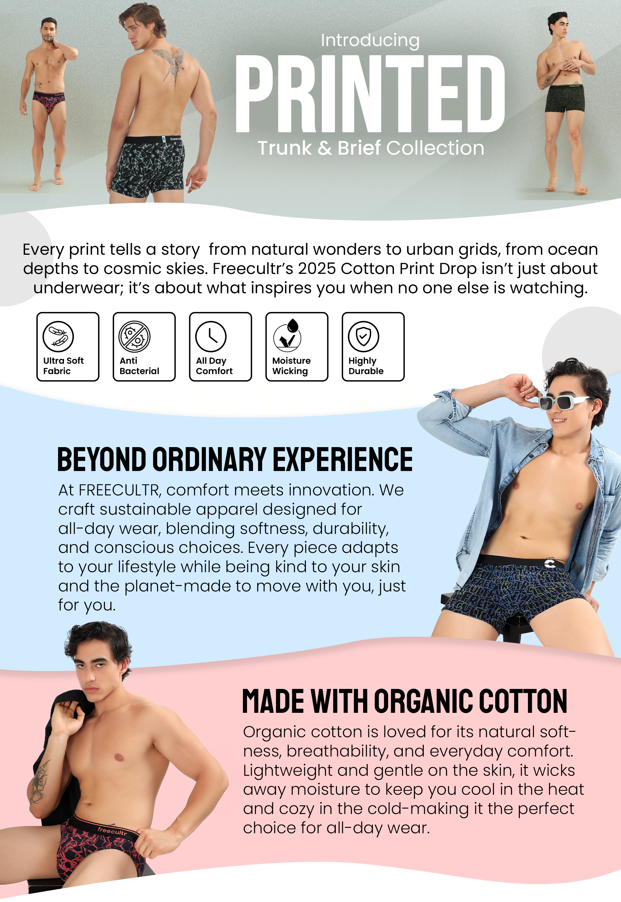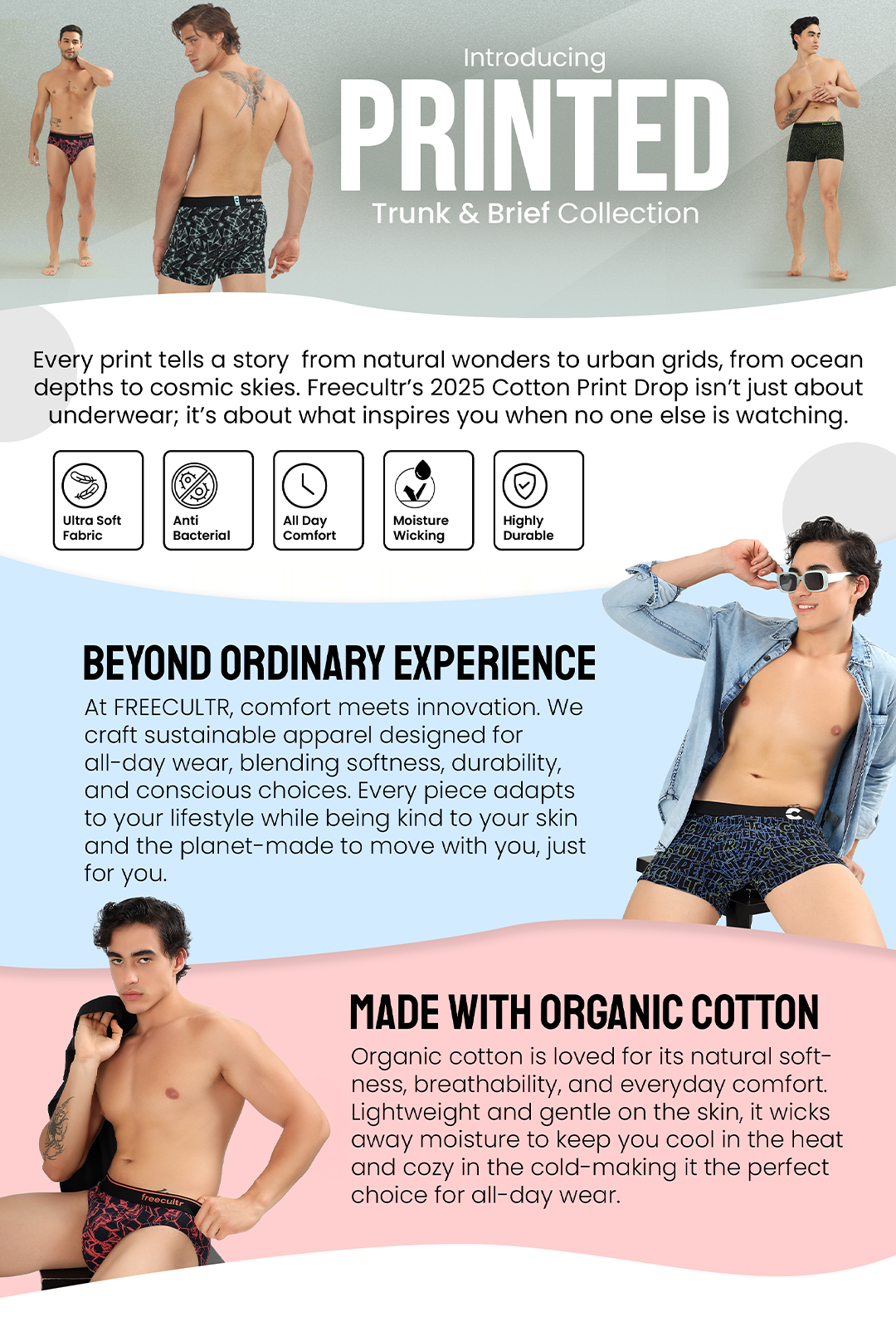 Sustainable, Like You: At Freecultr, we care about style and sustainability. That’s why our Print Series briefs are crafted using eco-conscious cotton and low-impact printing techniques. It’s our way of ensuring that while you look good, you also feel good about making the right choice for the planet.