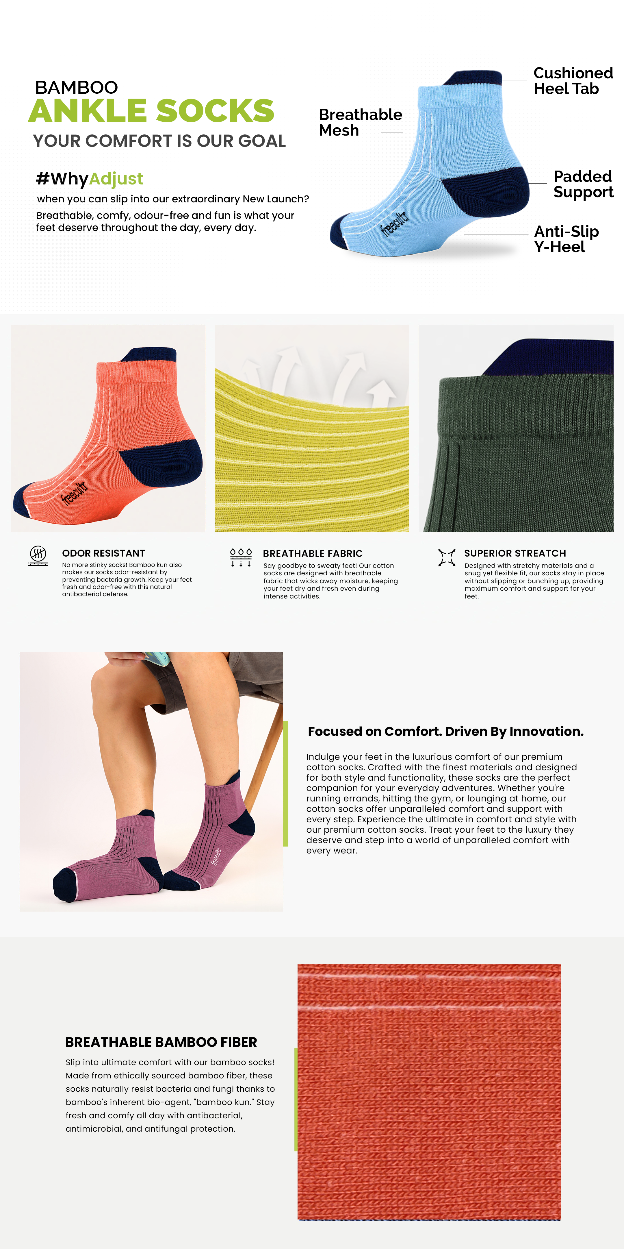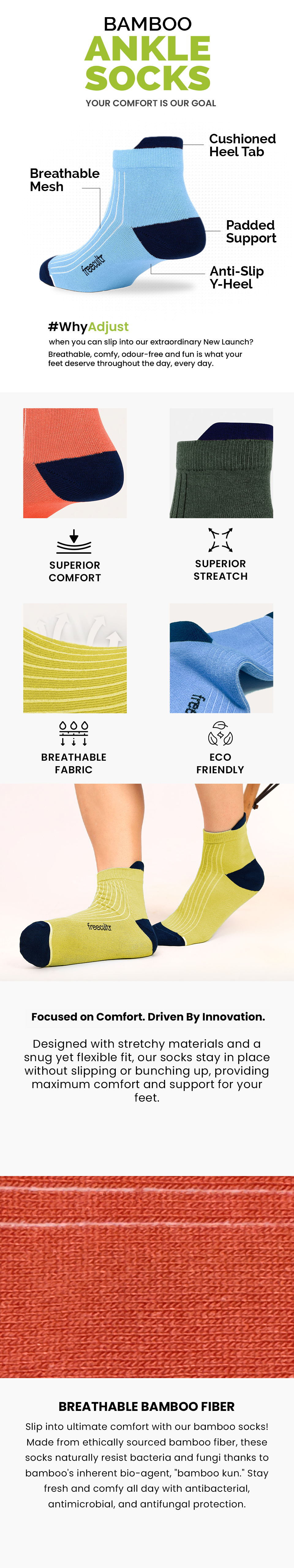 - Breathable Bamboo Fibre :- Our ankle socks will be a treat for your feet because they use ethically sourced bamboo fibre that is soft and super light in texture. Another unique property of bamboo fibre is that it also makes the socks antibacterial, antimicrobial and antifungal.