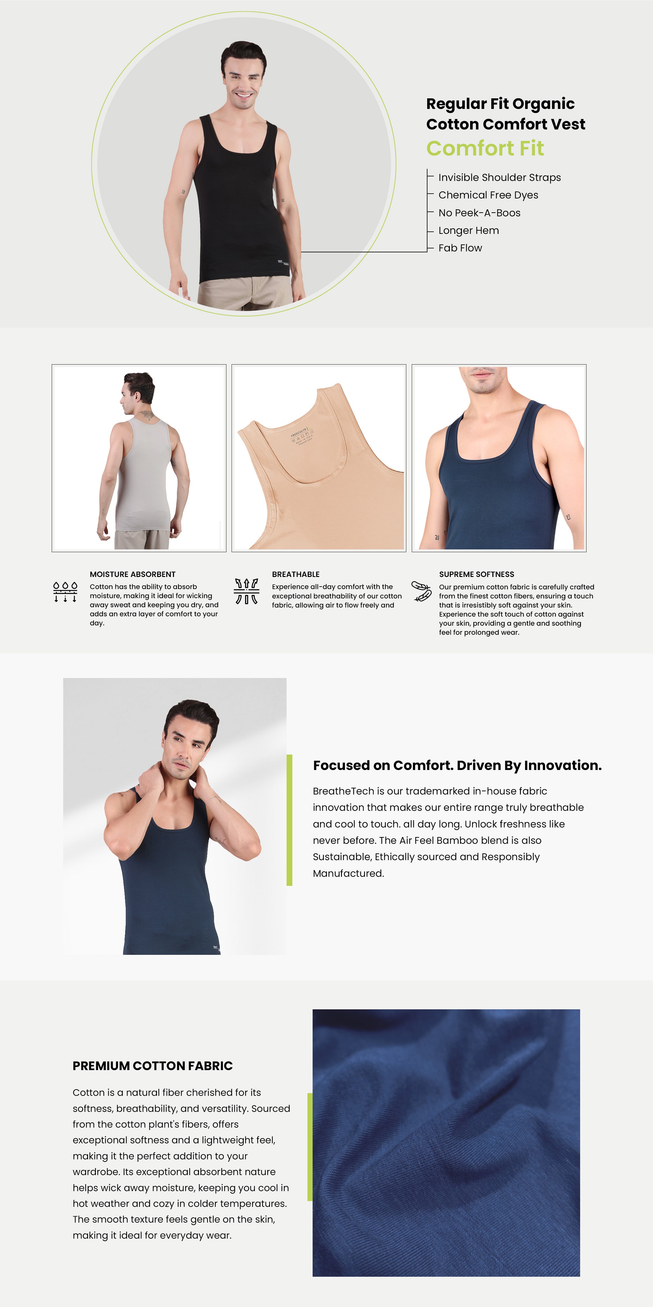 - All-Day Freshness: Stay fresh and dry with our Cotton Comfort Vest's moisture-wicking properties. The fabric efficiently absorbs and evaporates sweat, keeping you cool and comfortable even during active pursuits or in warm weather.