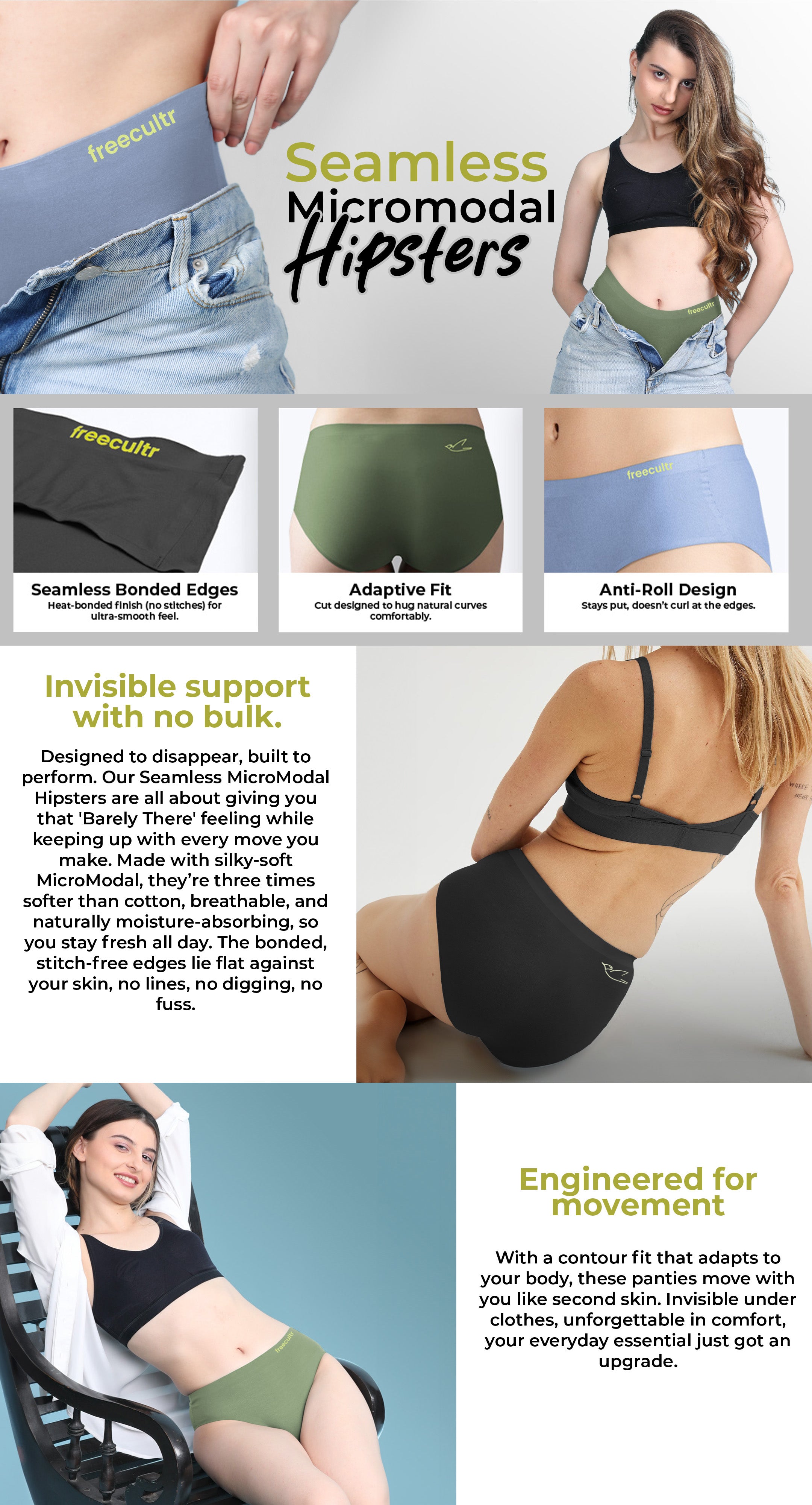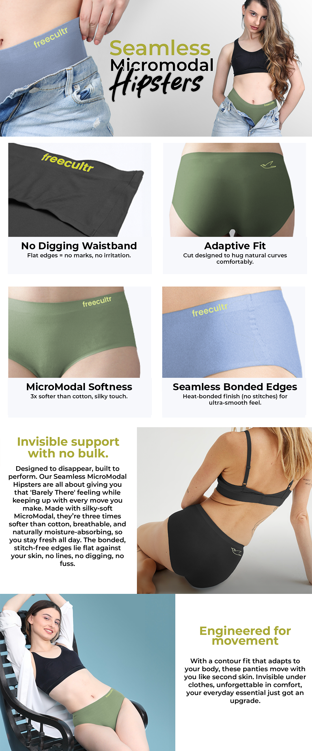 Designed to disappear, built to perform. Our Seamless MicroModal Hipsters are all about giving you that 'Barely There' feeling while keeping up with every move you make. Made with silky-soft MicroModal, they’re three times softer than cotton, breathable, and naturally moisture-absorbing, so you stay fresh all day. The bonded, stitch-free edges lie flat against your skin, no lines, no digging, no fuss.