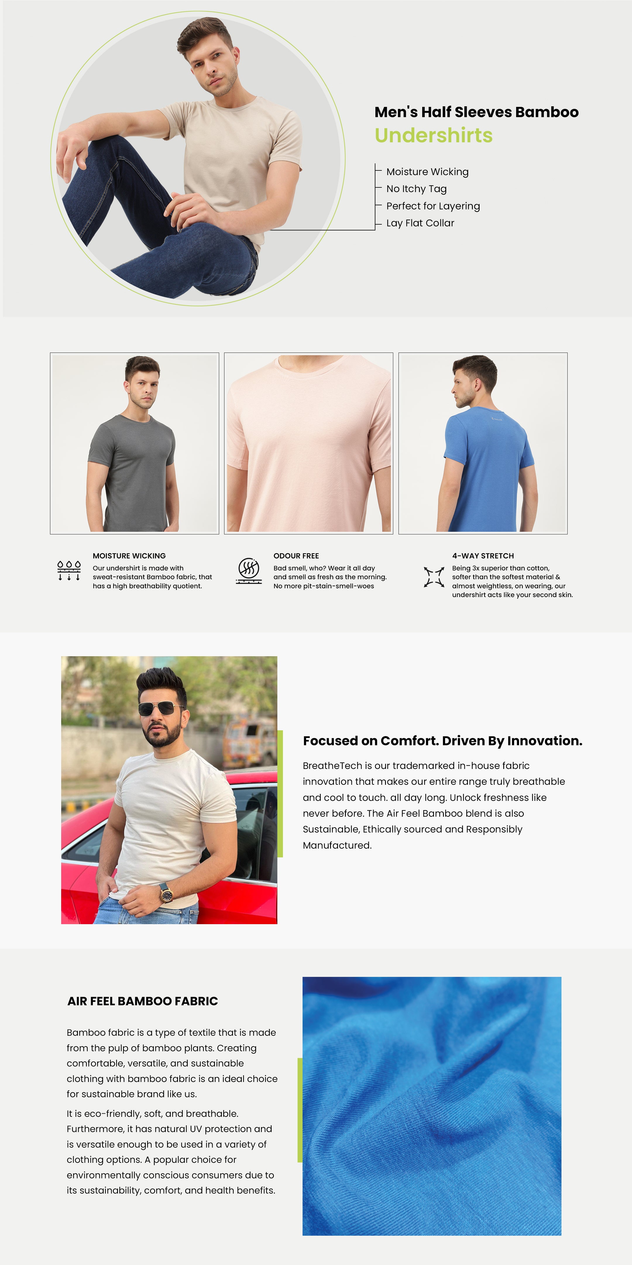 Sweat Soaking Panel: Dual-layered armpits and bamboo-cotton-spandex fabric composition prevent sweat-spotting. No matter where you live or what you do, no sweat stain is what we claim!