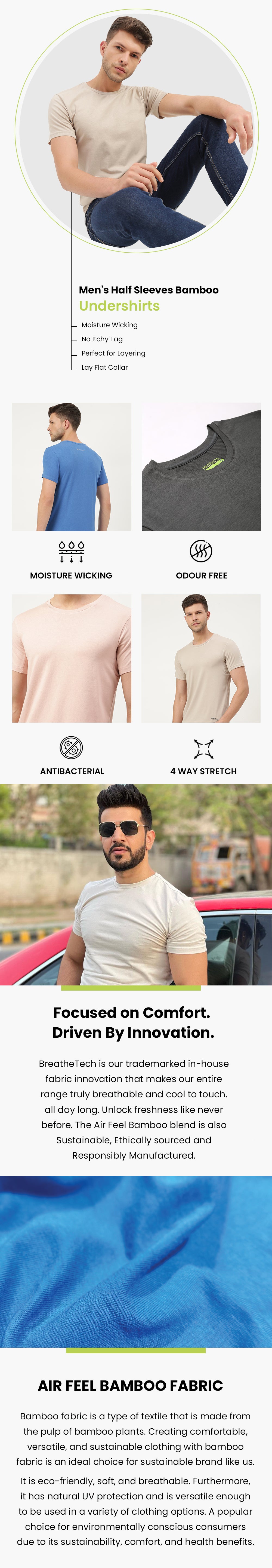Elevate your comfort and style with our Men's Half Sleeves Bamboo Undershirts. Crafted from premium bamboo fabric, these undershirts offer unparalleled softness, breathability, and moisture-wicking properties, keeping you cool and dry all day long. With a sleek and versatile design, they provide the perfect foundation for any outfit, whether you're dressing up for work or keeping it casual on the weekends. Experience the luxury of bamboo and upgrade your wardrobe essentials today.