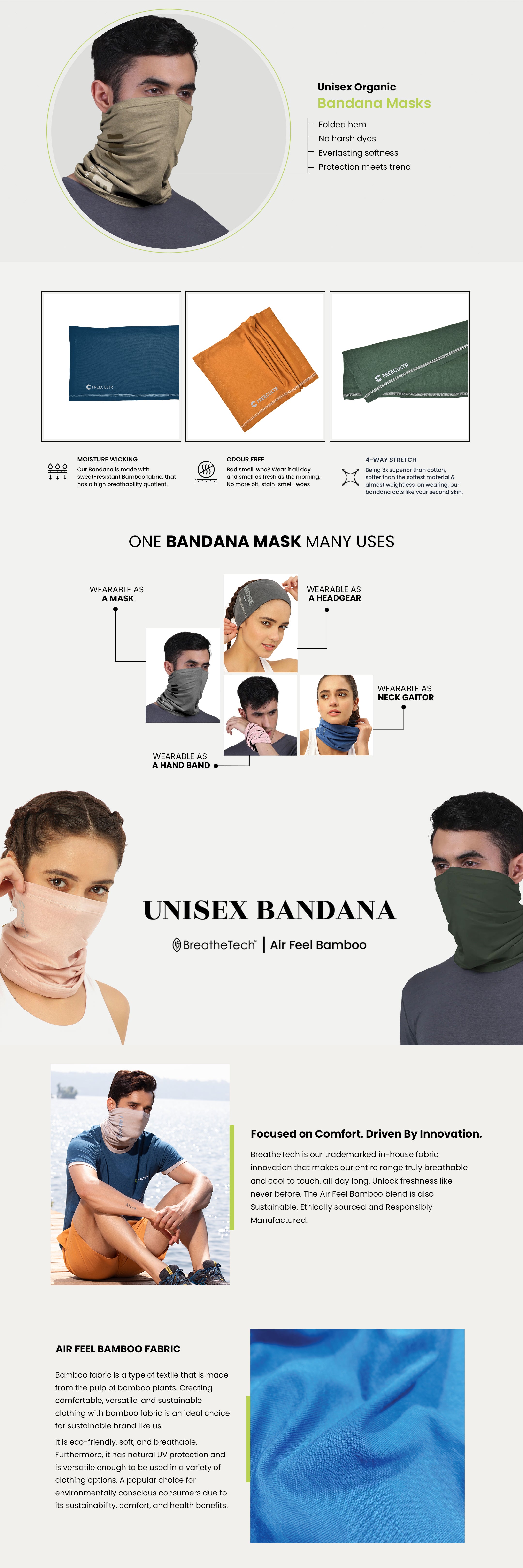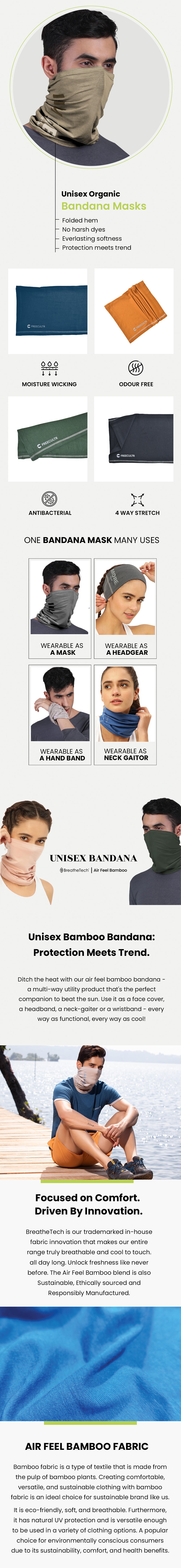 Crafted from a highly breathable bamboo-cotton-spandex blend, the more skin-contact it gets, the more it softens. Not forgetting, our bandana mask never ages. Rather, continues its journey to ultimate softness with every wash.